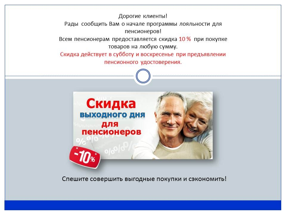 Важная и приятная новость! Мы запустили программу лояльности для потребителей достигших пенсионного возраста - в выходной день при предъявлении пенсионного удостоверения снижаем стоимость покупки на -10%. Спешите совершить выгодные покупки и сэкономить! Сумма покупки НЕ ОГРАНИЧЕНА.